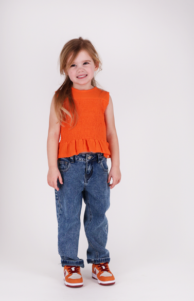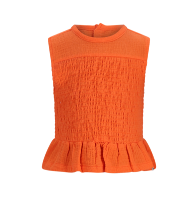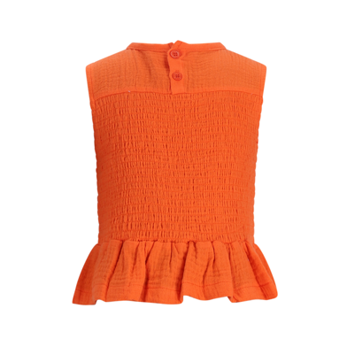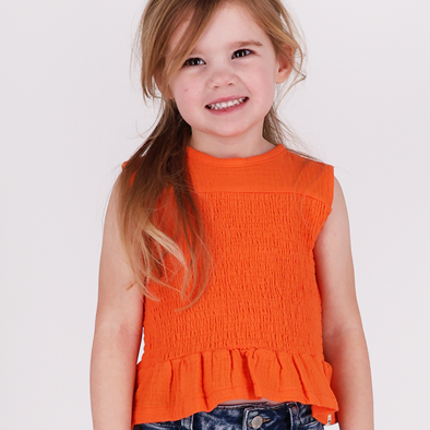 Hoe leuk is deze top Melle? Speels en zomers! Deze oranje top heeft een fijn streepdessin en een uitlopende onderzijde wat zorgt voor een vrolijke uitstraling. De mouwloze snit maakt het perfect voor warme dagen. Let op, deze top valt klein, bestel een maatje groter.