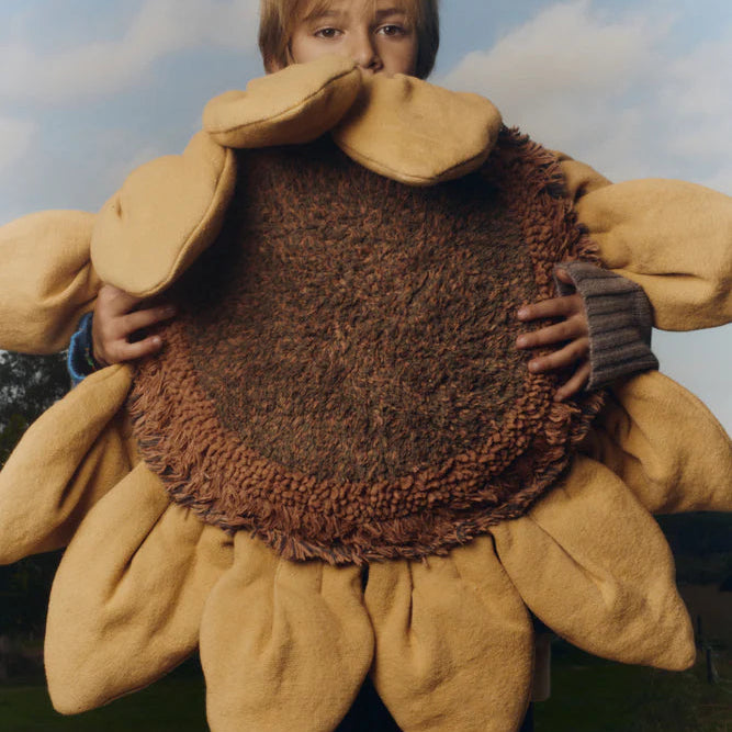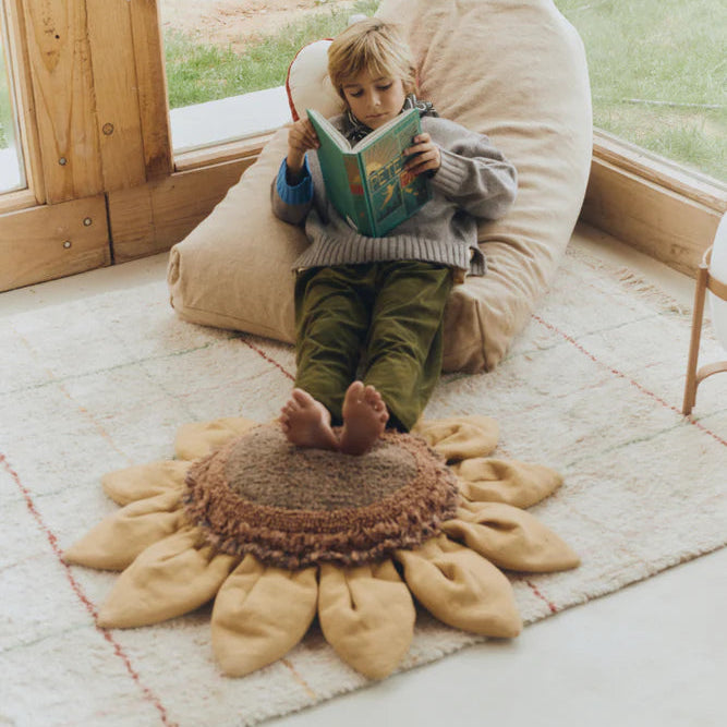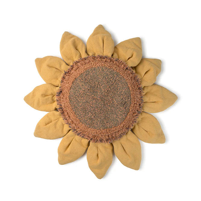 Jouw kamer bloeit helemaal op met dit prachtige kussen. Het kussen heeft de vorm van een prachtige zonnebloem. Het is niet alleen een ontzettend leuke eyecatcher in de kamer van jouw kindje maar ook zeer geschikt om een boekje te lezen, mee te spelen of om lekker even op te ontspannen. Het cirkelvormige ontwerp heeft honingkleurige katoenen canvas bloemblaadjes, met een driekleurig getuft midden in gouden chenille en langere pooldetails. Helemaal leuk om meerdere kussens met elkaar te combineren om de kamer echt te laten bloeien.