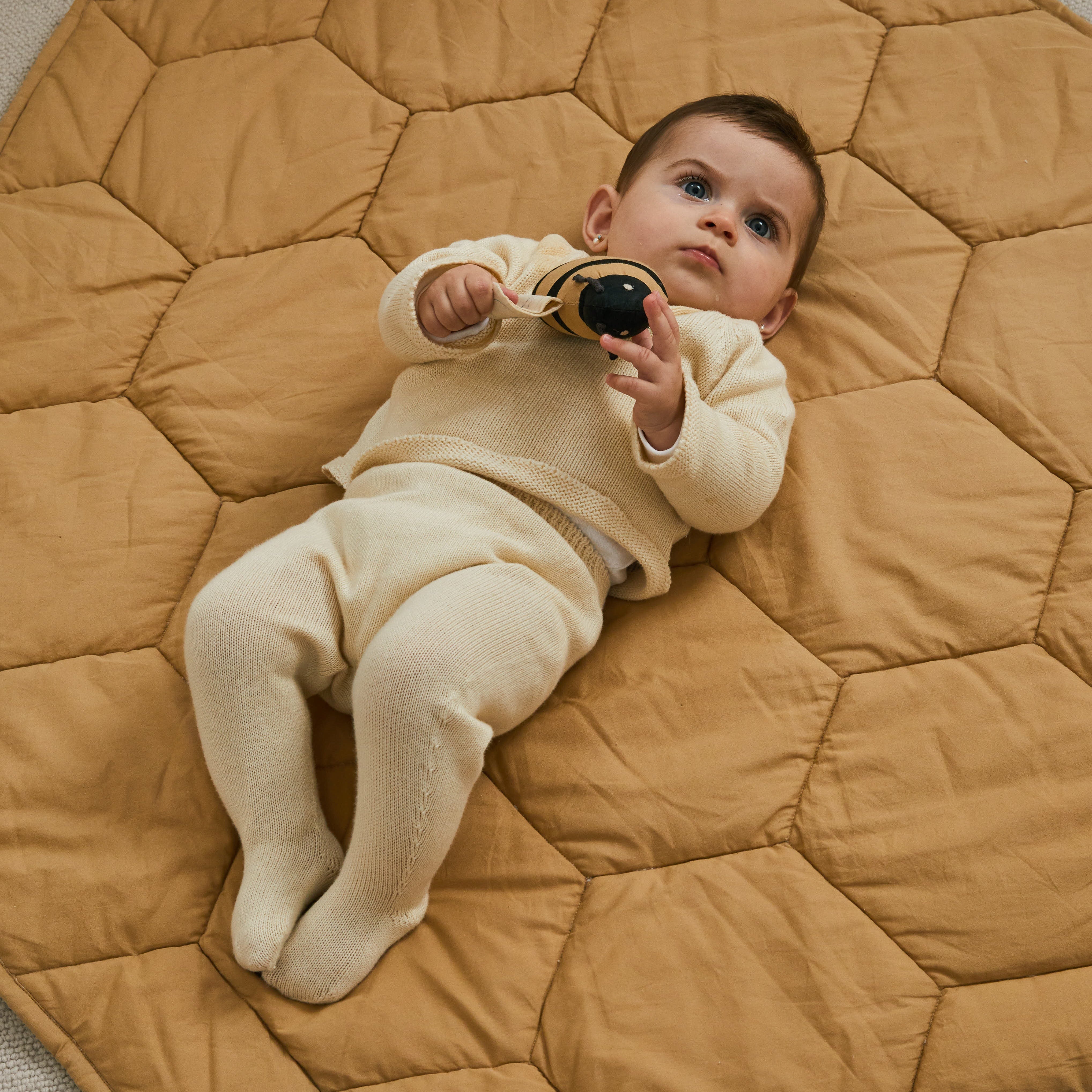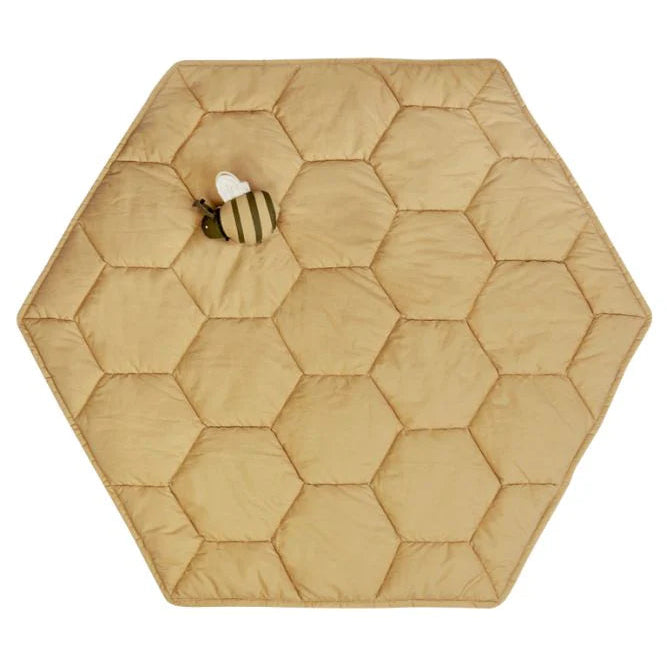 De Honeycomb speelmat is hexagonaal gevormd en gewatteerd in het karakteristieke honingraatpatroon. Gemaakt van zachte biologische katoenen poplin in de kleur Honey en gevuld met zachte gerecyclede polyfill. De speelmat wordt geleverd met een charmante rammelaar in de vorm van een bij, die kreukelig papier bevat.