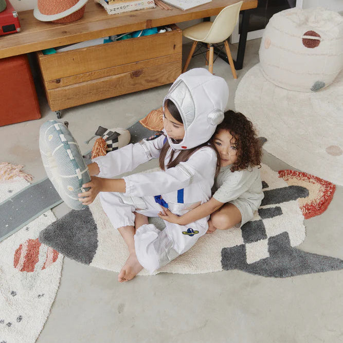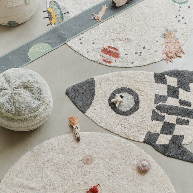 Met dit prachtige machine wasbare vloerkleed verander je de kamer van jouw kindje in een wereld van spelen, leren en ontdekken. Dit inspirerende vloerkleed is een absolute aanwinst voor iedere kamer. 3, 2, 1... Ready to go! Bereid je voor op een buitenaards avontuur met het Washable Rocket Rug! Een handgemaakt raketvormig tapijt gemaakt van natuurlijk katoen. De kleuren zijn donkergrijs en een mix van donkerblauw en groen, wat het een vintage tintje geeft. Met een rond raam en getufte vlammen aan het uiteinde om een raket te simuleren die wordt gelanceerd, zit dit tapijt vol details. Het wordt geleverd met een kleine astronaut die de kleintjes op elke ruimtereis zal vergezellen en creatief spel zal aanmoedigen. Het vloerkleed van Lorena Canals is geschikt voor iedere kamer. Naast de warme sfeer en betere akoestiek vangt het ook alle stofdeeltjes op die in de lucht dwarrelen. Maar deze vloerkleden van Lorena Canals zijn machine wasbaar dus erg praktisch in onderhoud.