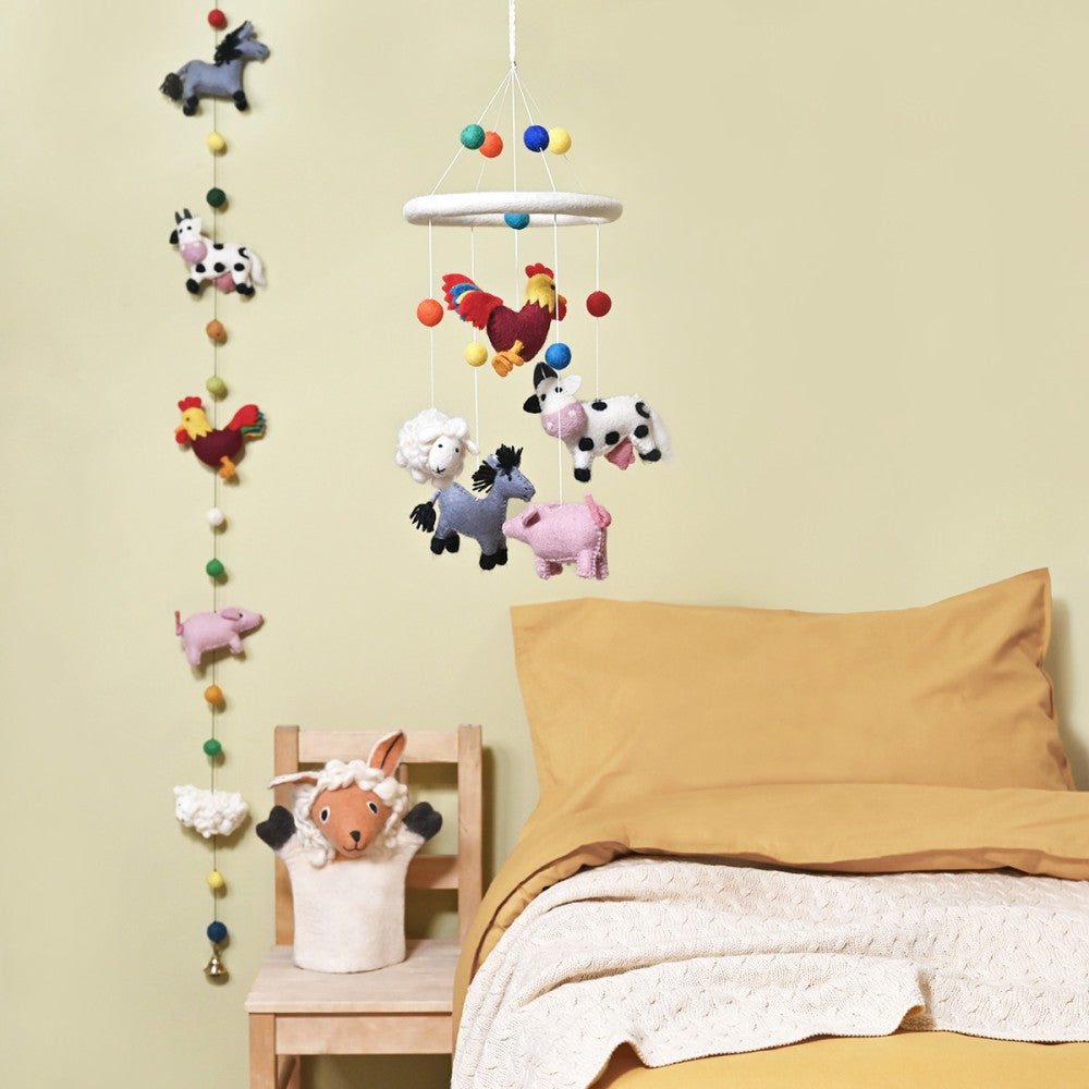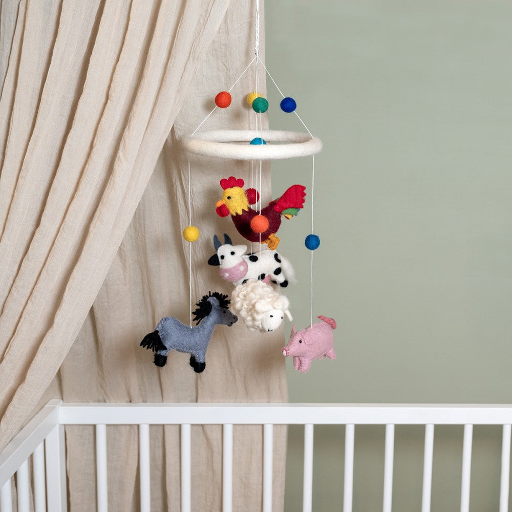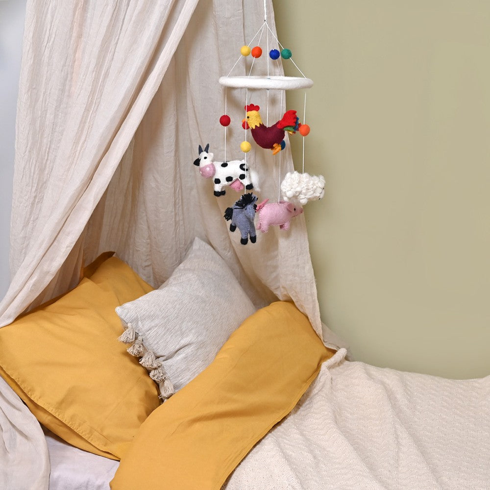 Deze sprookjesachtige mobiel met boerderij elementen gemaakt van vilt is een ware eyecatcher voor in de kamer van jouw kindje. Deze sfeervolle mobiel met boerderij elementen en dieren creëert een rustgevende en speelse sfeer in elke kinderkamer. Een prachtig decoratief stuk en een uniek cadeau voor jong en oud. Met de aanschaf van deze mobiel heb je een duurzaam product met een verhaal. Deze producten worden namelijk met de hand gevilt door vrouwen in Nepal. Lees het verhaal van sjaal met een verhaal hier!