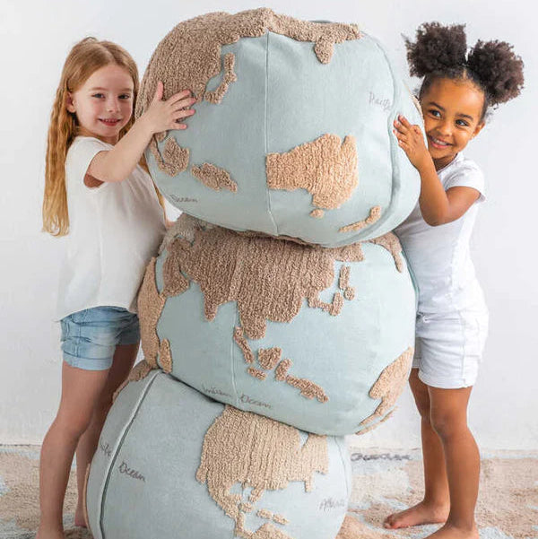 De wereld aan je voeten, met deze leuke wereldbol als poef. Deze heerlijk zachte poef van Lorena Canals is de perfecte poef voor jouw kindje om op te klimmen, mee te spelen of heerlijk een boekje op te lezen. Maar het is natuurlijk ook een hele leuke eyecatcher in de kamer van jouw kindje. De hoes van de poef is eenvoudig te wassen in de wasmachine. Verwijder de binnen vulling met behulp van de ritssluiting aan de onderkant.
