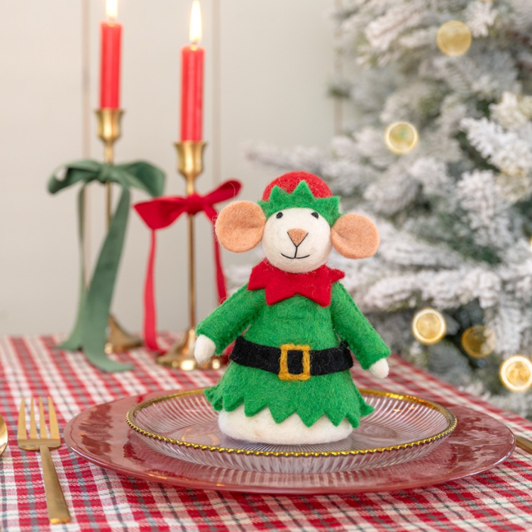 Vilten muis in een groen elfjespak, compleet met puntmuts en zwarte riem. Een vrolijke toevoeging aan je kerstcollectie. Zet hem neer tussen andere figuren of geef 'm een ereplekje op de schouw..