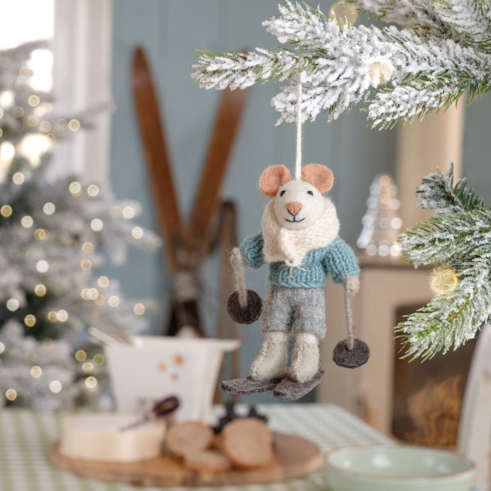 Een avontuurlijke muis op ski's, klaar om de sneeuw in te duiken. Met zijn ijsblauwe trui en warme sjaal trotseert hij de winterkou. Hang hem in de kerstboom of geef hem een winters plekje in huis.