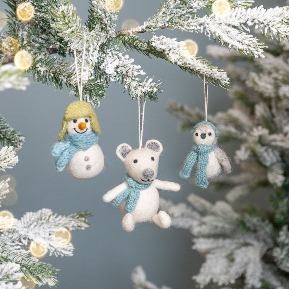 Deze vrolijke sneeuwpop hanger is gemaakt van wolvilt. De sneeuwpop heeft een ijsblauwe sjaal en warme muts. Hij brengt een knusse sfeer in huis of in de kerstboom. Hang hem in de kerstboom of als decoratie aan een tak voor een winterse uitstraling.