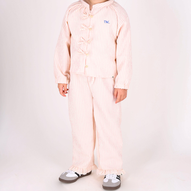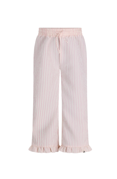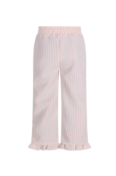 Deze vrolijke broek van de nieuwe collectie van de The New Chapter is gemaakt van heerlijk zacht materiaal. Deze stof voelt zacht aan op de huid van jouw kindje waardoor jouw kindje zich comfortabel en vrij kan bewegen. Broek Tate in wit met roze streepjes is een luchtige en comfortabele broek met een speelse uitstraling. De rechte pijpen en subtiele ruches aan de zoom geven de broek een zachte, girly touch, terwijl de elastische taille zorgt voor optimaal draagcomfort. Perfect voor zomerse dagen vol beweging. De broek heeft een elastische tailleband met strikkoord voor een fijne pasvorm, wit/roze streepdessin met speelse ruches aan de pijpen. Prachtig als set met de bijpassende blouse Izzy.