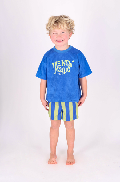 Deze vrolijke zwembroek van de nieuwe collectie van de The New Chapter is gemaakt van heerlijk zacht materiaal. Deze stof voelt zacht aan op de huid van jouw kindje waardoor jouw kindje zich comfortabel en vrij kan bewegen in het water. Zwembroek Vic is klaar voor eindeloos spetteren, springen en zonnen. De frisse blauw-groene strepen geven deze zwembroek een vrolijke, zomerse uitstraling, terwijl de comfortabele pasvorm zorgt dat niets in de weg zit tijdens het spelen. Perfect voor stranddagen, zwembadavonturen en vakanties vol waterpret. De zwembroek is gemaakt van gerecycled polyester. Ideaal want deze zwembroek is sneldrogend en licht van gewicht. Aan de bovenkant heeft hij een elastische tailleband met strikkoord voor een fijne, verstelbare pasvorm. Ideaal voor actieve zomerdagen aan zee of bij het zwembad.