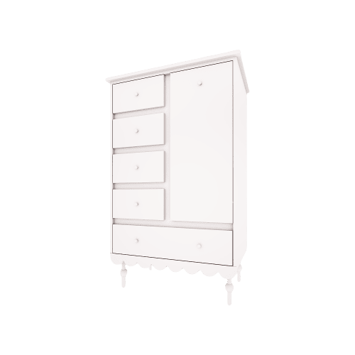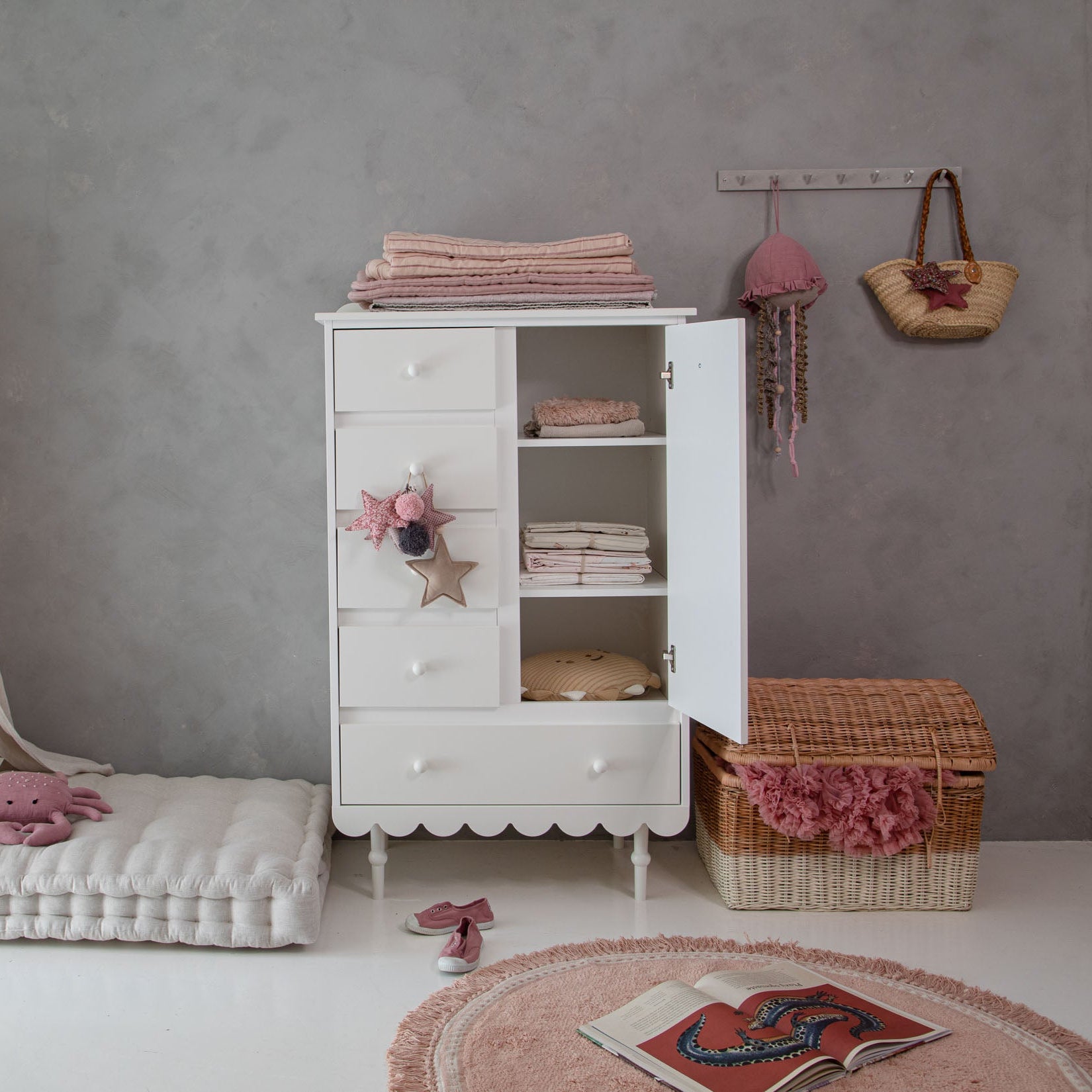 Deze charmante ladekast in retrostijl is een absolute eyecatcher in elke kamer. De ladekast heeft aan de ene kant vijf lades en andere kant een deur met daarachter drie planken. Zowel de lades als de deuren zijn voorzien van hoogwaardige geleiders en scharnieren met soft close. Dit betekent dat de deuren en lades zacht dicht vallen. De kast heeft voldoende ruimte om alle spulletjes van jouw kindjes in op te bergen.